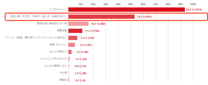 今年、スーツ着用の機会を増やしたいと回答した人は意外にもビジネスシーンでもっと着用したいという気持ちが強い。また、コロナ下の影響で自由に外出することが困難だったことから、スーツを着用してお祝い事や、飲食店へ行きたいという声が多くみられる。