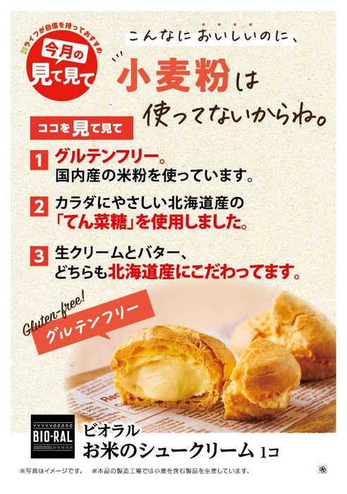 小麦粉に含まれるグルテンを摂らない食生活として健康志向の方から注目を集めている「グルテンフリー」。気軽にグルテンフリーのスイーツをお楽しみいただけるよう、健康や添加物に配慮したプライベートブランド“BIO-RAL”から、小麦粉を使用せずにつくったシュークリームが誕生いたしました。「BIO-RAL お米のシュークリーム」は、小麦粉の代わりに国産米粉を使用したグルテンフリーのシュークリームです。素材にもこだわり、北海道産のてん菜糖・生クリーム・バターが生み出すやさしい味わいは、一般的なシュークリームと変わらないおいしさです。