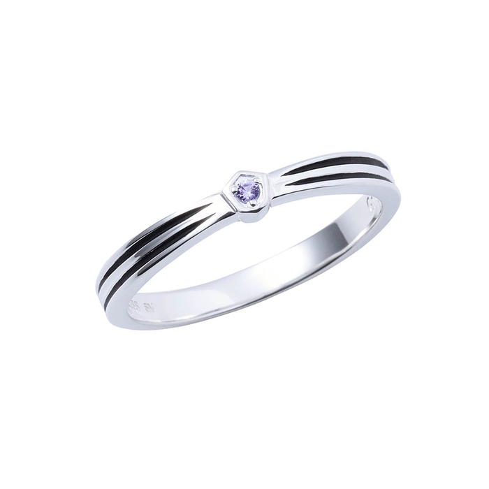 ストレートフォルムのリングに背中のリボンを取り込み、イメージカラーのパープルのストーンをセット。内側には名前と肉球を刻印しました。