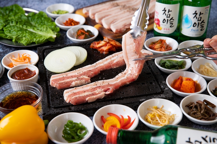 卓上で厚切り豚肉を焼き、全14種の自家製ナムルとキムチと合わせてお楽しみいただけます。