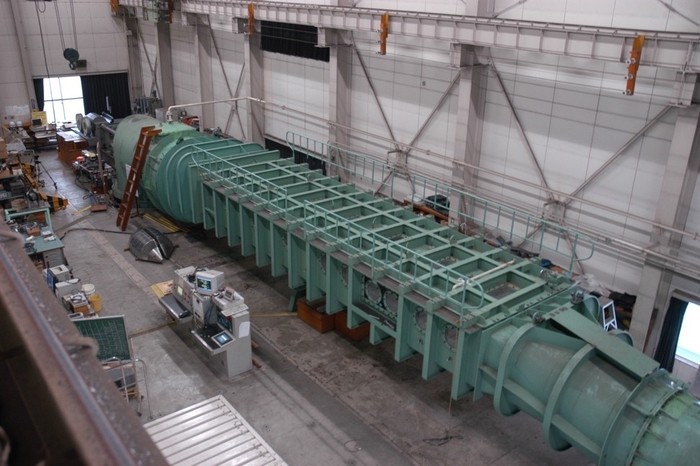 大型キャビテーション試験水槽は、プロペラが発生するキャビテーションの観測やキャビテーションに起因する船尾変動圧力や騒音などを計測できる水槽です。本水槽は、プロペラ単独で試験を行う計測胴(第1計測胴)だけではなく、曳航水槽で使用した模型船を使用する計測胴(第2計測胴)があり、船体、舵、その他の付加物による影響を考慮した試験を行うことができる点が大きな特徴です。