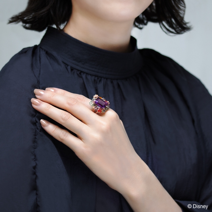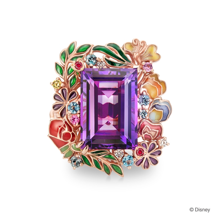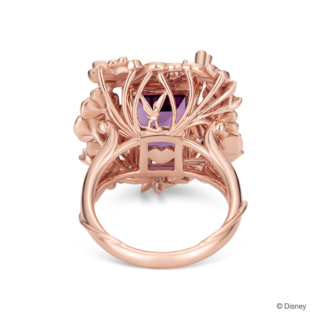 このほどの新作は、“妖しくも美しい花々のガーデンに迷いこんで”をコンセプトに、ダイヤモンド、ロンドンブルートパーズ、ピンクトルマリンなど色とりどりの宝石や彩り豊かな樹脂加工を用いて、不思議な物語の世界観をラグジュアリーに表現しています。ディズニー創立100周年を祝し、「Disney100(ディズニー・ワン・ハンドレッド)」をテーマにしたPremium Jewelryです。