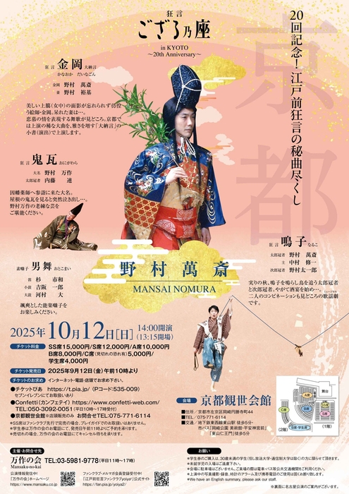 『狂言ござる乃座 in KYOTO ~20th Anniversary~』が2025年10月12日 (日)に京都観世会館(京都府 京都市左京区 岡崎円勝寺町 44)にて開催されます。