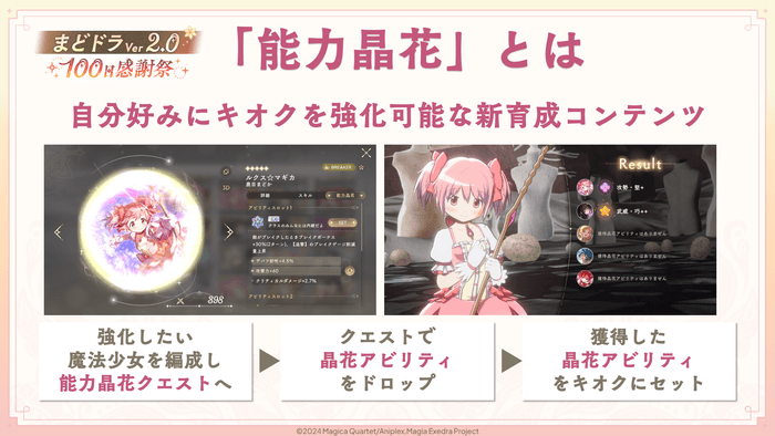 「魔法少女まどか☆マギカ Magia Exedra」はリリース100日を記念して、『まどドラVer2.0』100日感謝祭 第2弾 10大キャンペーンを開始いたしました。また、7月15日(火)に配信した生放送では、新育成機能を含む5大アップデートの情報も公開いたしました。