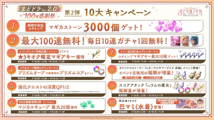株式会社アニプレックス(本社:東京都千代田区 代表取締役 岩上敦宏 以下アニプレックス)は、『魔法少女まどか☆マギカ Magia Exedra』(Magia Exedra:マギアエクセドラ)において、7月16日(水)12:00より、『まどドラVer2.0』100日感謝祭 第2弾10大キャンペーンを開始いたしました。10大キャンペーンでは、最大100連ガチャ無料や、ログインでマギカストーン3,000個、新★5キオク 巴マミ(水着)登場、オリジナルストーリーのイベント「エターナルサマーデイズ 前編」開催など盛りだくさんの内容となっています。