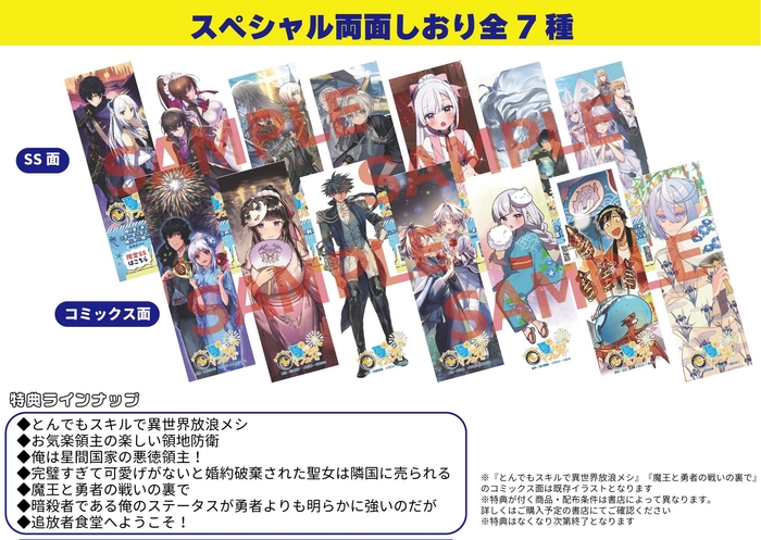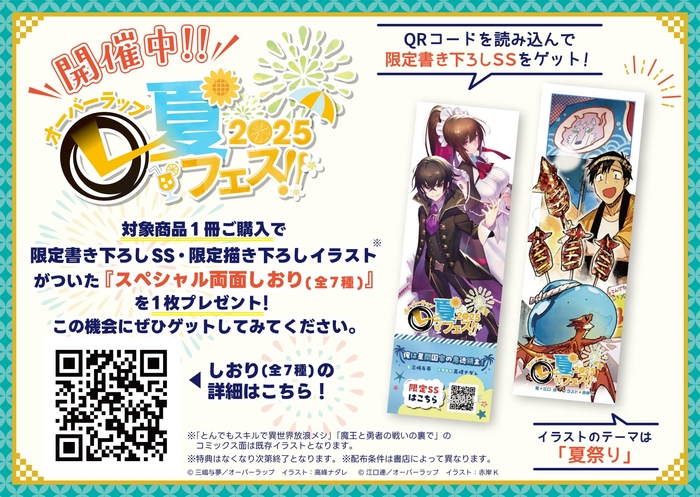 また、夏フェス開催を記念したオリジナル図書カードが当たるプレゼントキャンペーンや、2025年にTVアニメが放送される『とんでもスキルで異世界放浪メシ』と『追放者食堂へようこそ!』の両面うちわがもらえるフェア、さらにはオーバーラップ12周年フェアも同時に開催。