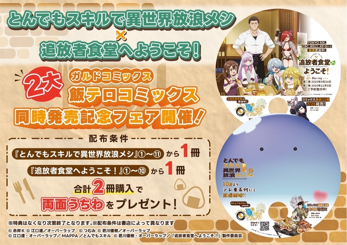 TVアニメのシーズン1が再放送中、さらに10月よりシーズン2も始まる『とんでもスキルで異世界放浪メシ』と、TVアニメ放送中の『追放者食堂へようこそ!』が、どちらも7月25日にコミックス最新巻発売決定!