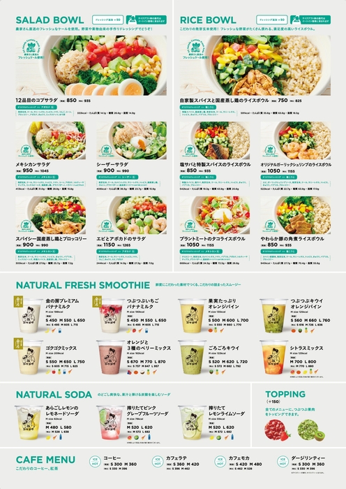 今回の出店にあたり、「サラダボウル」にプラスして、発芽玄米を使用した「ライスボウル」がメニューに仲間入り。エビや豚の角煮などを使った、ランチ・ディナーとしてより満足感のあるラインナップを追加しました。フードコートへの出店となるため、カフェメニューも取り揃え、より幅広い層のお客さまにご満足いただけるよう、ラインナップを進化させました。