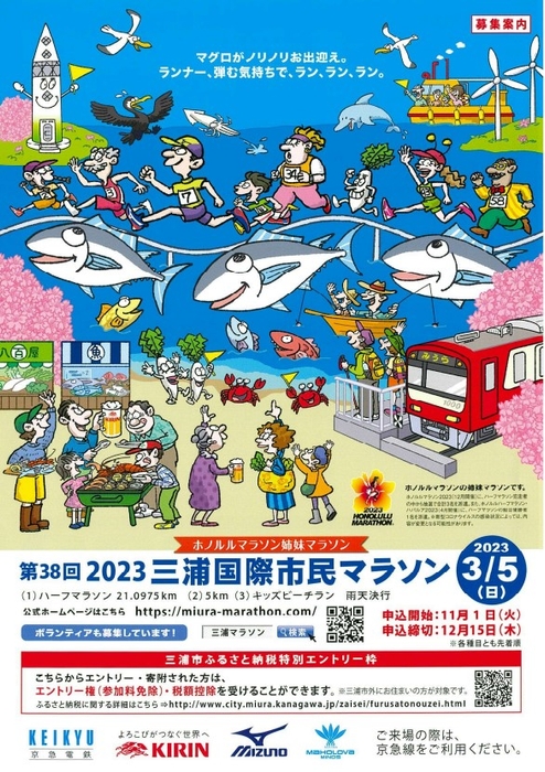 申し込みは、RUNNETやスポーツエントリー、LAWSON DO! SPORTSで受付中です。詳しくは「三浦国際市民マラソン」大会ホームページまで。