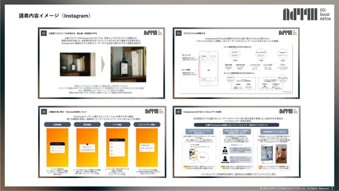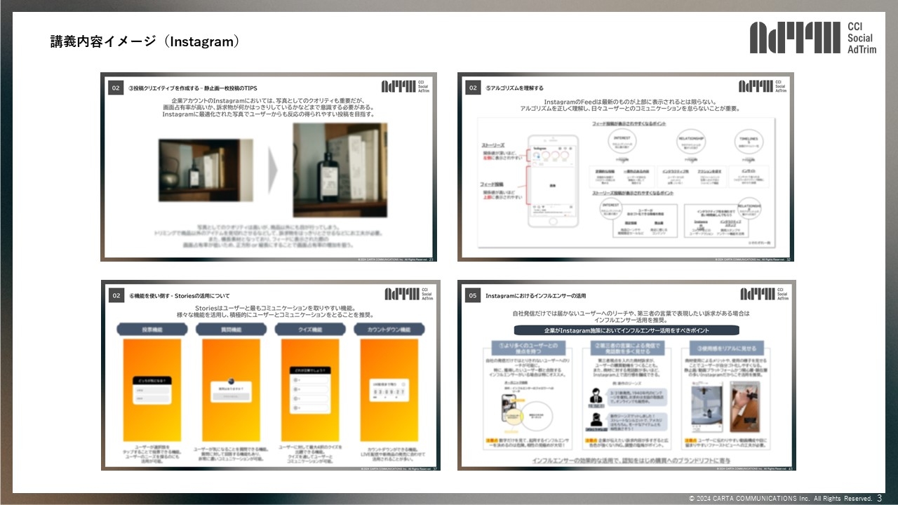 投稿企画の考え方からクリエイティブの作り方に関するTIPS、各SNSのアルゴリズムに加え、過去の炎上事例やインフルエンサー活用の際の注意点など、すでにSNSを活用している企業様向けの内容も含まれております。新入社員研修などにも最適なパッケージとなっておりますので、是非ご活用をご検討下さい。