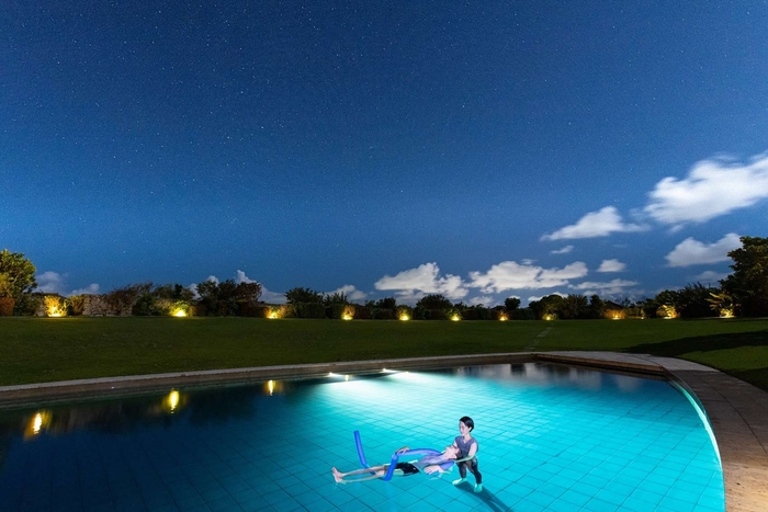 滞在初日の夜に、星のや竹富島のプールで「星空浮遊浴」を実施します。星空浮遊浴では、夜空を埋め尽くす星々の下、プールの中でスタッフが優しく身体を左右に揺らし深いリラックス状態へ誘います。ゆったりとしたリズムに身を任せ、心を落ち着かせることができる体験です。完全に脱力して水面にゆらゆら浮かびながら、視界いっぱいに広がる星空を眺められます。
