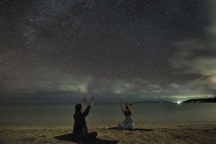 滞在2日目の夜、頭上に満天の星が広がる頃にコンドイ浜で「プライベートてぃんぬ深呼吸」をおこないます。「てぃんぬ」とは島の方言で「天の」を意味します。星空の下で波音を聴きながら、天に腕を伸ばすポーズや合掌などで心身をリラックスさせるストレッチと深呼吸です。コンドイ浜に打ち寄せる波はとても穏やかで、聞こえるのは優しく心地よい波音のみ。静かな海辺で気持ちが落ち着き、緊張がほぐれて圧巻の星空を見ることができます。