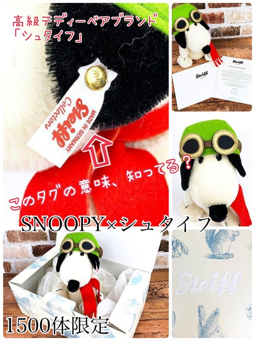 1877年に誕生したテディベアの最高級ブランド「シュタイフ」1体あたり数十万で取引されることもある、ドイツのテディベアメーカーです。そのシュタイフから1500体限定で「フライング・エース」のスヌーピーが生産されました!調べてみたところ、シュタイフのぬいぐるみの耳についているタグには意味があるらしい…!