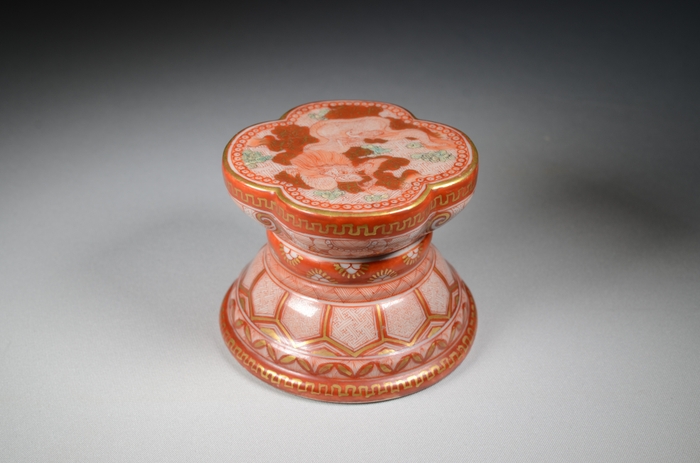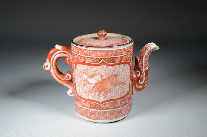 宮本屋窯の赤絵は、黒みがかった赤(通称・血赤)で文様を細かく描き込んだ赤絵細描と、金彩とともに赤以外の上絵釉を用いた点が特徴です。また画題の一部に、中国・明時代の墨の文様集『方氏墨譜』から着想を得たことで独自の表現を広げました。とりわけ、主画工・飯田屋八郎右衛門(1801~1848)が、細密描写に優れた手腕を発揮しました。