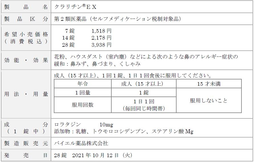 大正製薬株式会社[本社:東京都豊島区 社長:上原 茂](以下、当社)は、アレルギー専用鼻炎薬「クラリチンⓇEX」に28錠入りを細別追加することとし、10月12日より発売いたします。