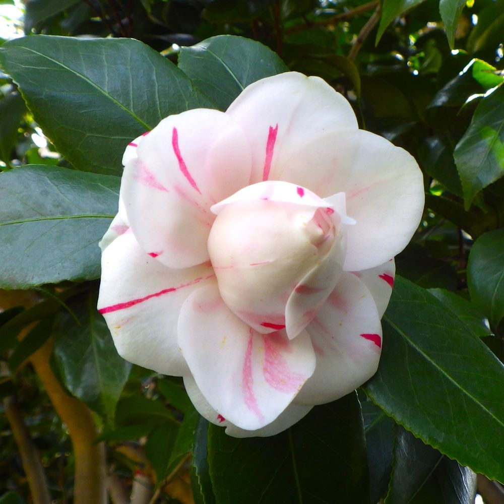 ‘神代桃錦(ジンダイモモニシキ)’は、神代植物公園のバックヤードに植えられていたツバキで、花の径が6㎝程度に比して宝珠が大きく、重量感があり桃太郎の桃を思わせます。咲きはじめの形が桃の形に似て、花色が白色の地に濃紅色の筋模様が入ることから‘神代桃錦’と命名。令和4年に新品種登録の認定を受けました。