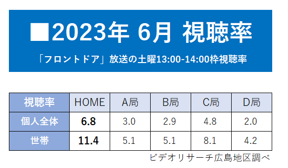 広島ホームテレビ(本社:広島市中区)で毎週土曜ごご1時から放送、ひろしま深掘りライブ「フロントドア」は、2023年6月の月間平均視聴率で個人全体・世帯ともに同時間帯1位(ビデオリサーチ調べ、広島地区)を記録しました。個人視聴率は2か月連続、世帯視聴率は2022年4月から15カ月連続で1位となります。