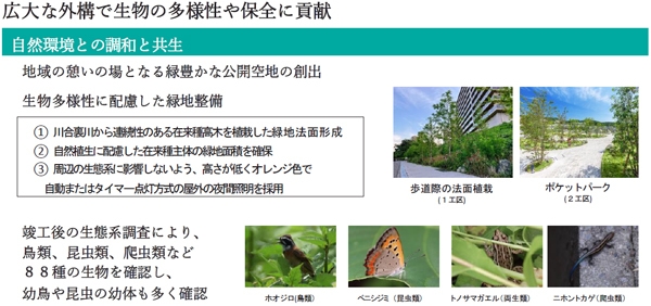 本物件は開発の過程で山を切り開いて作られた街の原風景を想起させる植栽計画を策定。緑地率約40%、約7,000本の苗木を列植することにより、起伏のある広大な法面を可能な限り活かした総372戸(1工区:202戸/2工区:170戸)の分譲マンションです。ゆとりある緑地帯の形成や、周辺環境との調和、生物多様性の保全、環境配慮による地域への貢献について評価されました。