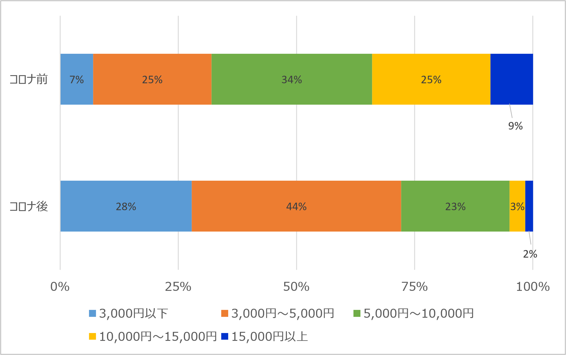 1回あたりの費用が「3,000円以下」または「3,000円~5,000円」と回答した人がコロナ前は32%であったのに対し、コロナ後は72%と、40%も増加しました。