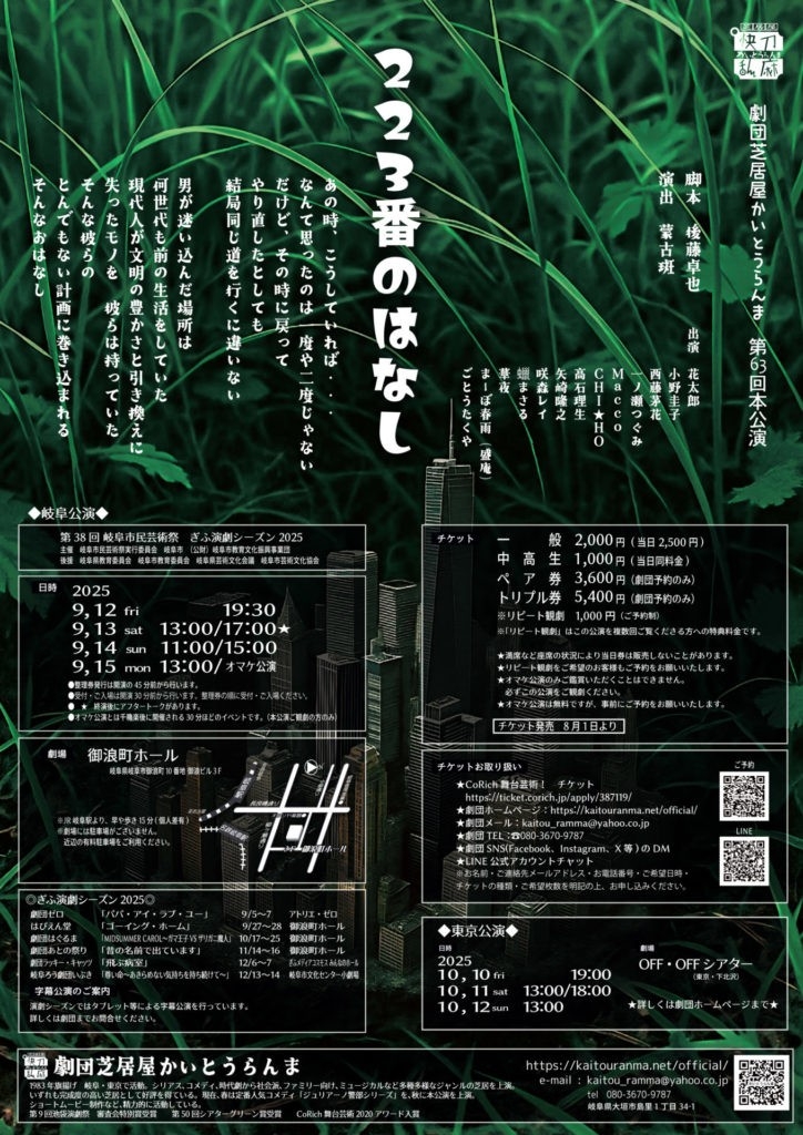 劇団芝居屋かいとうらんま主催、第63回本公演『223番のはなし』が2025年10月10日 (金) 〜 2025年10月12日 (日)に下北沢 OFF・OFFシアター(東京都 世田谷区 北沢 2-11-8 TAROビル3F)にて上演されます。 チケットはカンフェティ(運営:ロングランプランニング株式会社、東京都新宿区、代表取締役:榑松 大剛)にて2025年8月23日(土) 00:00~予約受付開始です。