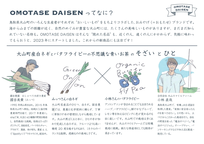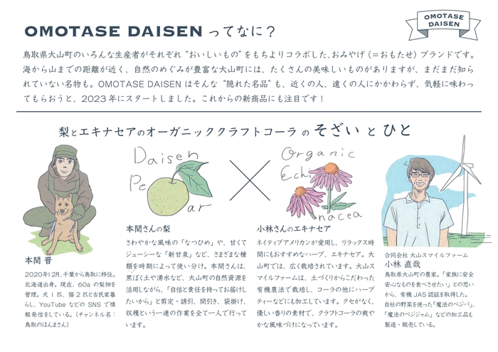 有機農産物生産及び有機農産加工品製造を行う合同会社大山スマイルファーム(所在地:鳥取県西伯郡大山町岡559、代表:小林 直哉、以下 大山スマイルファーム)は、おみやげブランド「OMOTASE DAISEN(オモタセダイセン)」の立ち上げ及び新商品2商品を、1月20日より発売いたします。