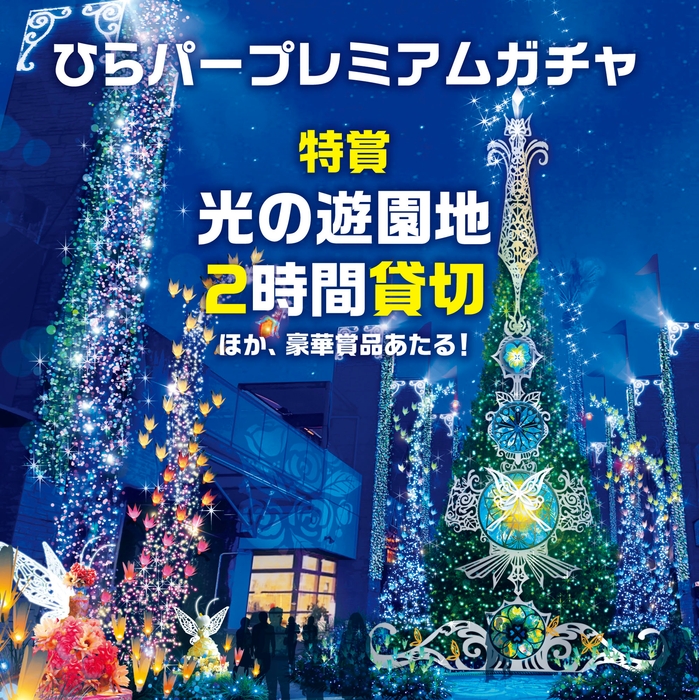 ウインターカーニバル内に「ひらパープレミアムガチャ」を設置します。特賞「光の遊園地」貸切のほか、ひらかたパークペア入園券やオリジナルグッズなど、豪華賞品が当たるチャンスです。