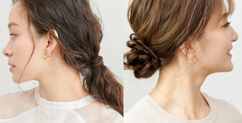 ハートやスターモチーフのミニフープピアス。普段取り入れない方でも、メタルデザインが洗練させた雰囲気で、大人可愛い印象に仕上がります。