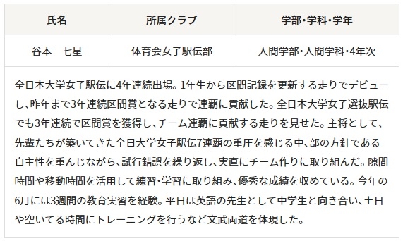 優秀な学業成績及び競技成績や運動部活動等への貢献を残して文武両道を実践する他の学生の模範となる個人を表彰する。