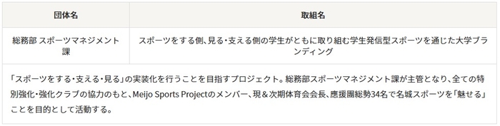 大学スポーツの普及や活性化、大会等における集客・応援促進のための先進的な取組を表彰する。