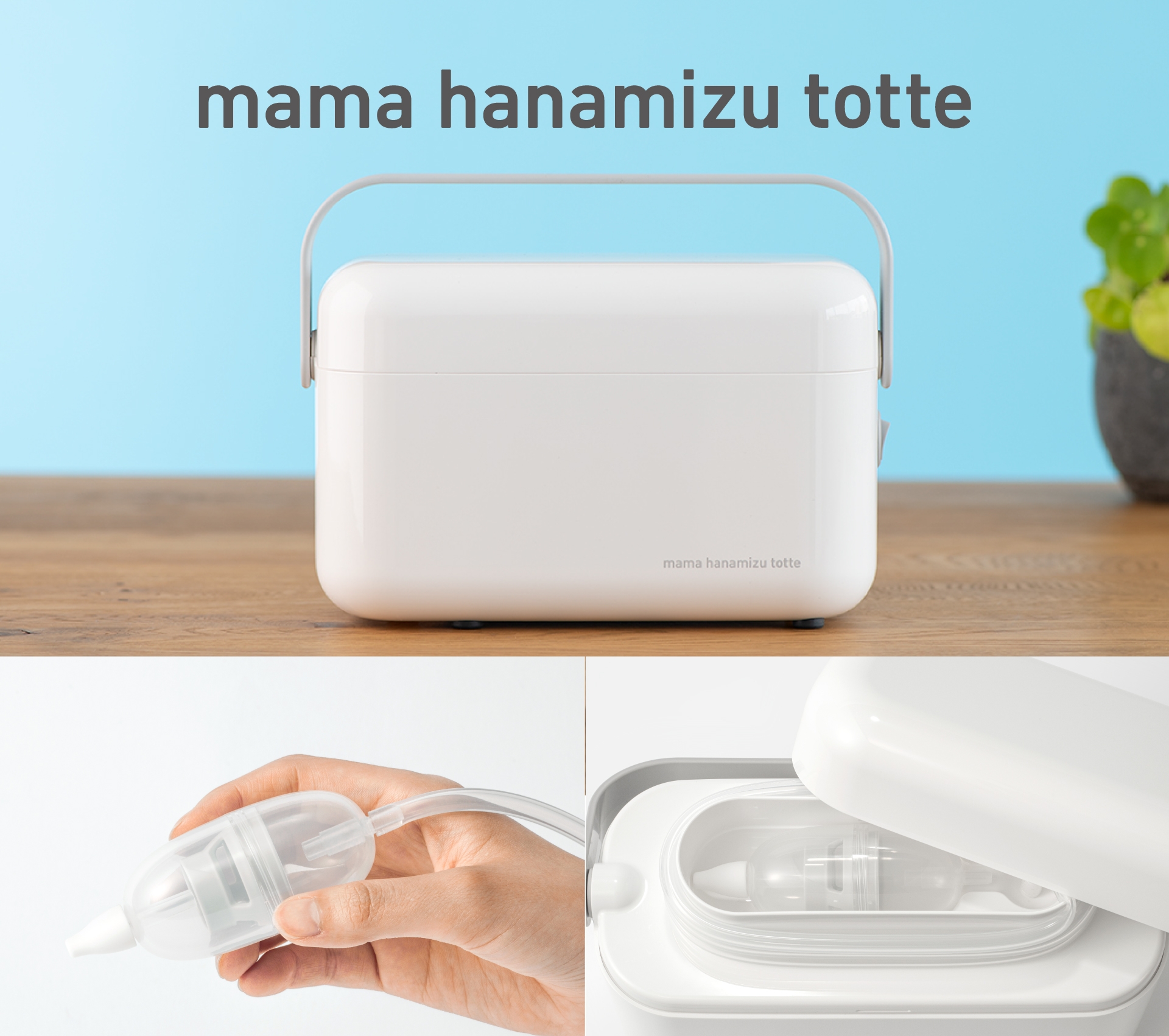 先端の鼻水タンクやチューブが本体に収納でき、持ち運びにも便利なハンドル付きでスッキリとしたデザインにしました。鼻水タンクは小さな手の方にもフィットするたまご型でどんな体勢でも使用できます。
