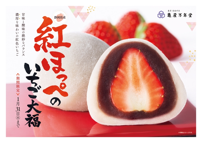 1月は、甘味と酸味が絶妙なバランスの静岡県産「紅ほっぺ」と、北海道産小豆を使用したなめらかなこしあんを合わせ、もっちりやわらかな餅生地で包んだ『 いちご大福 』(1個291円(税込)・常温販売)を2024年1月4日(木)より1月31日(水)まで、東京・自由が丘にある総本店をはじめ直販26店舗(東京・神奈川)にて販売いたします。