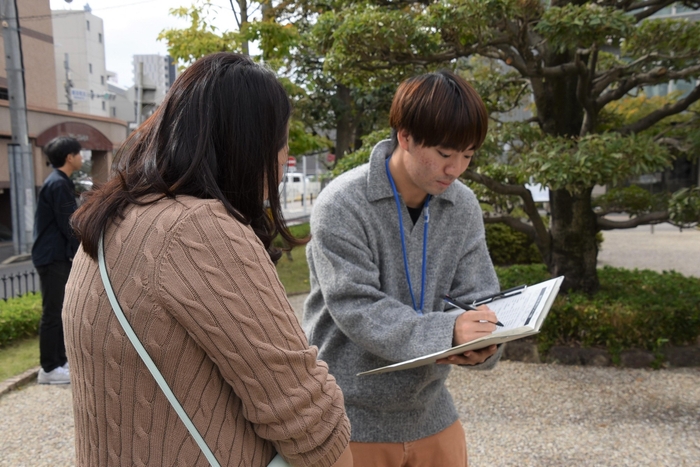 牧野浩也さんは「最初は抵抗感がありましたが、いざ話しかけると予想以上に多くの方が協力してくださり、データだけでなく経験と学びを得ることができました」。西澤紗良さんも「反応を見ながら調査することは難しかったですが、会話を重ねる中で観光客のリアルな声を聞くことができ、貴重な経験になりました。結果を詳細に分析し、多くの方に『文化のみち』に関心を持っていただける提案を考えていきたいです」と話していました。