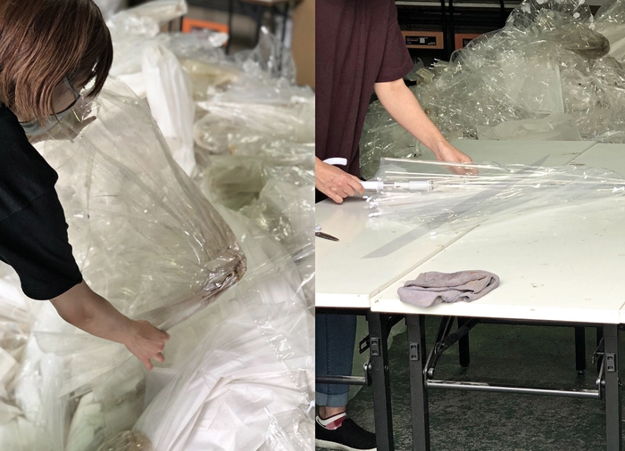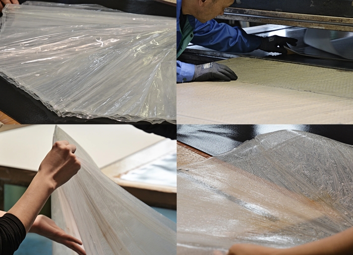 今回登場したのは「マルチショルダーケース」より、1点1点模様が異なるカラーモデルを新発売いたしました。ビニール傘にはクリアな無地の素材だけでなく、カラーのものや絵柄が入っているものと様々あります。その様々な素材や色が異なるカラー傘を、より細かな選別を行うことにより「マルチショルダーケース カラーモデル」が実現しました。ビニール傘は粉砕などせずに水を一切通さない素材本来の特性を活かし、様々な色や柄のカラー傘を何層にも重ねてプレスをする事により作られています。