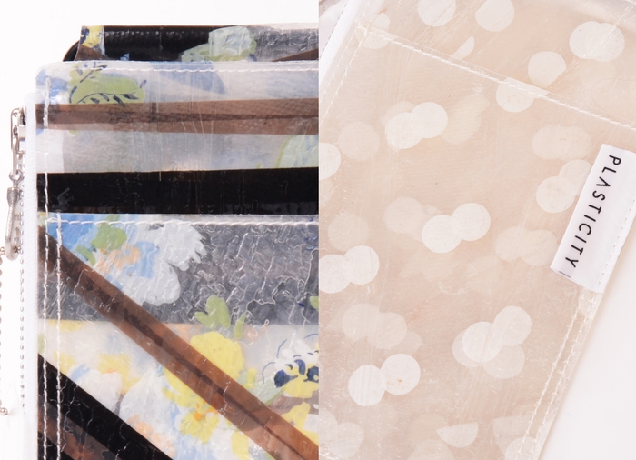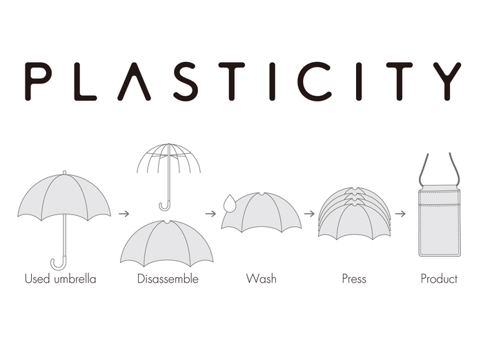 PLASTICITYは2020年4月より販売を開始した新ブランドとなり、全ての製品には廃棄されたり忘れ物として保管された後に最終的に廃棄されてしまうビニール傘を全面にリサイクルをしています。防水性やメンテナンス性といった傘の持つ素材の特性を最大限活かすため、そのままの状態にて何層にも重ねてプレスをする独自の加工方法を開発。さらに、加工工程にて雨模様の表情を生み出す事により他の製品には無い独特な質感を持つ製品が完成しました。