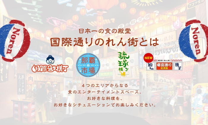 『国際通り横丁』『那覇市場』『琉球横丁』『竜宮通り粉もん横丁』の4つのエリアからなる食のエンターテイメントスポット。個性豊かな約30店舗が軒を連ねる横丁です。どこか懐かしくもあり見た目にも愉しい内装と、ありそうでなかったエッジの効いた業態の数々が皆様をお出迎え致します。そして【流し】によるパフォーマンスがより一層食事を愉しいものにし、ほかの横丁では楽しめない唯一無二の空間が国際通りのれん街にはあります。