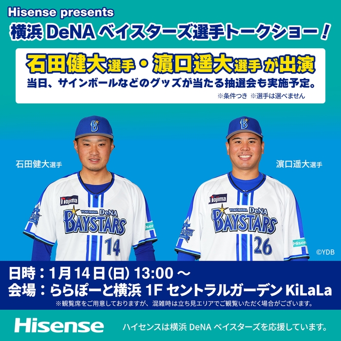 総合家電メーカー、ハイセンスジャパン株式会社(所在地:神奈川県川崎市、代表取締役社長:李 文麗)は、神奈川県横浜市を拠点に活動するプロ野球チーム「横浜DeNAベイスターズ」のユニフォームスポンサー(ホーム試合用ユニフォームの左袖)を務めており、この度、横浜DeNAベイスターズ石田 健大選手と濵口 遥大選手を招いたトークショーを2024年1月14日(日)13時から“ららぽーと横浜1FセントラルガーデンKiLala”にて開催します。イベント終了後にはサインボールなどが当たる大抽選会も実施予定です。