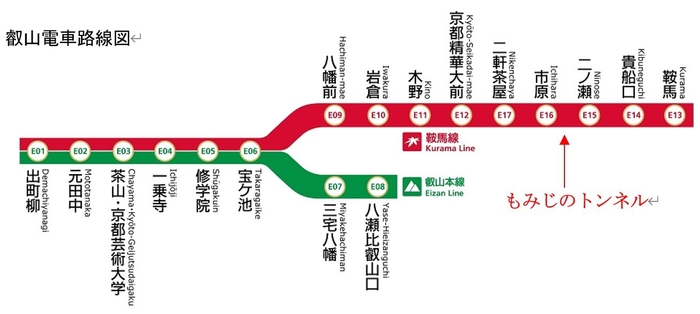 鞍馬線市原駅~二ノ瀬駅間の「もみじのトンネル」区間(約250m)をライトアップし、同区間を通過する列車は車内の明かりを消してゆっくりと走ります。併せて、二ノ瀬駅、貴船口駅でもライトアップを実施します。