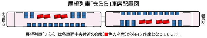 ・展望列車「きらら」の座席は固定となっており、進行方向に転換できるタイプの座席ではございません。外向き座席以外、往路または復路のいずれかが進行方向と逆向きになります。