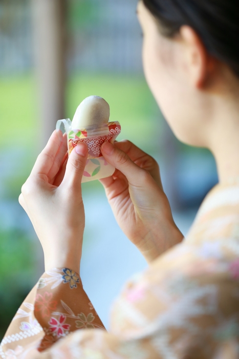 「和菓子にも新しい生活様式を」という想いから、緊急事態宣言中の2020年4月から開発は始まりました。これまで当社は、器や懐紙に盛り付けることを前提とした和菓子を販売してきましたが、衛生面に配慮しつつ出来たてのお餅を楽しんでいただくことをコンセプトに、一般的に和菓子では使用しない「深絞りフィルム」を採用。手を汚すことなく食べることができ、在宅ワークのお供やご自宅でのおやつタイムにも気軽に手を伸ばしていただける餅菓子を開発いたしました。やわらかな羽二重餅にあっさりと炊き上げた北海道産小豆を包み、蓬は滋賀県伊吹山のものを使用しています。