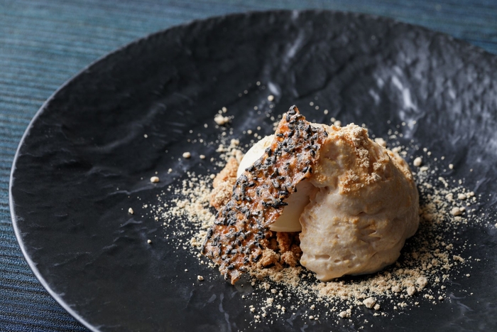 ・デザート:バニラアイスと黒蜜ジュレ きな粉のエスプーマを添えて/珈琲または紅茶
