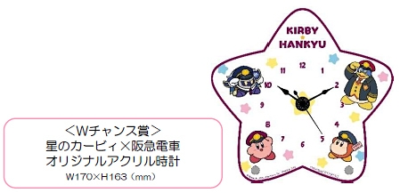 抽選で100名様に「星のカービィ×阪急電車 オリジナルアクリル時計」を進呈します。応募方法などの詳細は、「星のカービィ×阪急電車」特設
