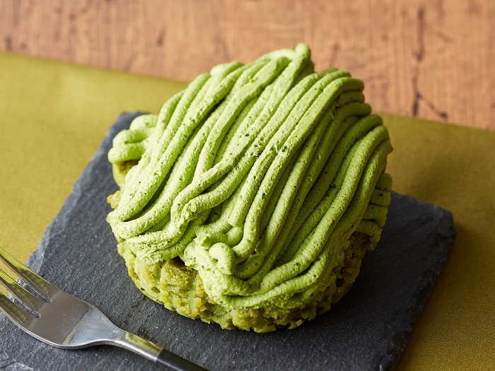 濃厚な抹茶ケーキの上に、ホイップクリーム、抹茶ソース、抹茶モンブランクリームを絞った、抹茶好きのためのスイーツです。