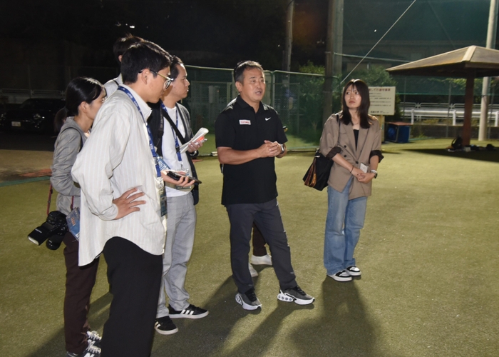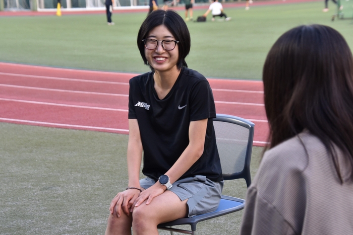 取材会では、集まった一般紙やスポーツ紙、テレビ局などの記者やカメラマンに走り込みなどの練習風景を公開したほか、米田監督と谷本七星キャプテン(人間学部4年)、米澤奈々香副キャプテン(人間学部3年)、上野寧々選手(同)がそれぞれ個別の取材に応じて記者からの質問に答えました。