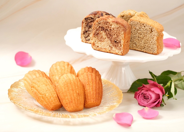 ザ ヴィーガンマシュマロの焼き菓子で人気No.1のマドレーヌと、パウンドケーキ2種類(紅茶・マーブル)をセットでお届けします。