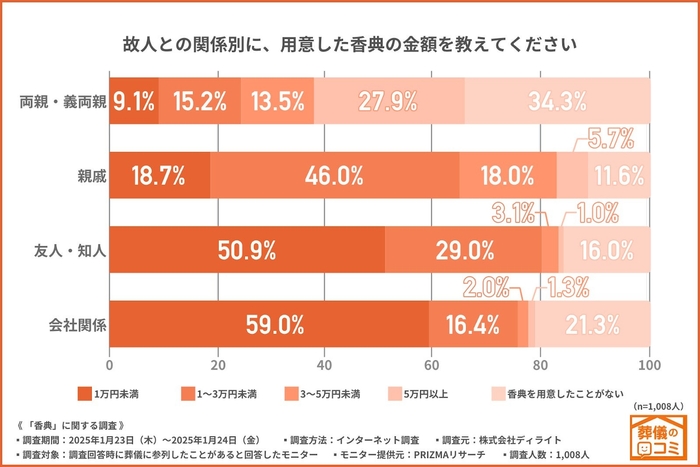 ・用意した香典の金額は、親戚は「1~3万円未満」、友人・知人と会社関係は「1万円未満」が主流