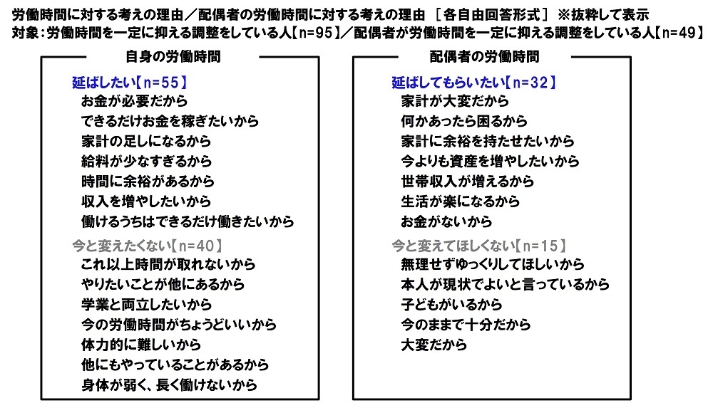 配偶者の労働時間について延ばしてもらいたいと回答した人では「家計が大変だから」「家計に余裕を持たせたいから」「世帯収入が増えるから」、今と変えてほしくないと回答した人では「無理せずゆっくりしてほしいから」「子どもがいるから」「今のままで十分だから」といった理由が挙げられました。