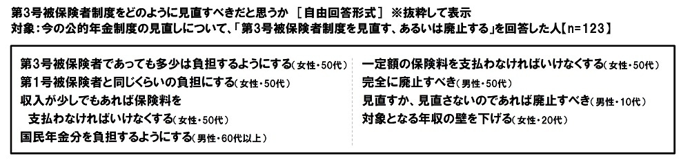 さらに、今の公的年金制度の見直しについて、「第3号被保険者制度を見直す、あるいは廃止する」を回答した人(123名)に、第3号被保険者制度をどのように見直すべきだと思うか聞いたところ、「第3号被保険者であっても多少は負担するようにする」「第1号被保険者と同じくらいの負担にする」「収入が少しでもあれば保険料を支払わなければいけなくする」「完全に廃止すべき」「見直すか、見直さないのであれば廃止すべき」「対象となる年収の壁を下げる」といった回答が挙げられました。