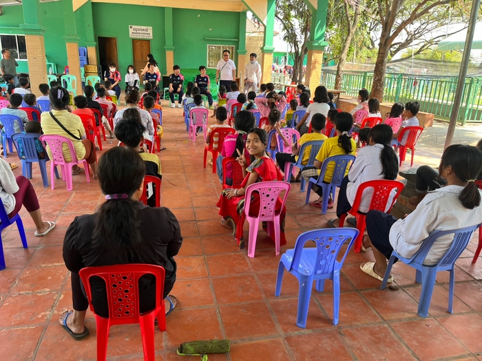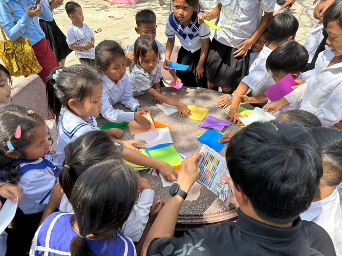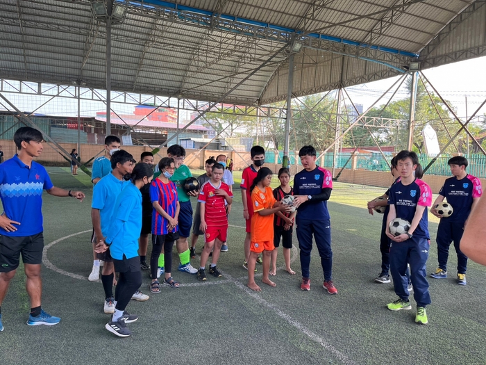 「スポーツSDGsスタディーツアー」と銘打って実施され、理学部応用数学科2年、尾迫岳さん ら5人が2月 21 日~28 日、プノンペンのライオンスポーツフィールド、NERC サッカーフィールドをはじめ、カンダール州の児童養護施設「ユニカス」、タケオ 州の圓山(まるやま)小学校を訪ねて、そこで練習している地域の子どもたちにサッカーボール計18 個をプレゼント。現地の支援スタッフとともにサッカーだけでなく、ジャンケン遊びをしたり、一緒に歌ったり折り紙を作ったりして交流しました。