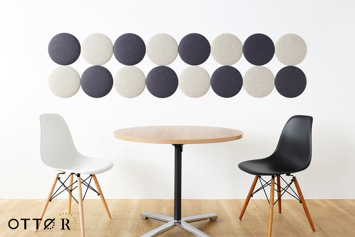 オフィス向け吸音パネル「OTTO R(オットー・アール)」は2021年6月の発売以来、豊富なカラーと手軽さが好評でオフィス以外でも保育園や大学、一般のご家庭まで幅広くご使用いただいております。既存の4種の形状に加え新たに登場する丸型は同形状で3サイズ(直径20cm、30cm、45cm)あり、大きさの異なるパネルを組み合わせることでこれまでと違ったクリエイティブなデザインが可能に。また直径20cmのパネルは一般のご家庭でも取り入れやすいサイズで、壁のちょっとしたスペースや小さなお部屋への設置にもおすすめです。設置方法は付属のマグネット、または両面テープで壁に貼り付けるだけなので、組み合わせを楽しみながら様々なシーンに合わせた快適な音環境づくりが出来ます。