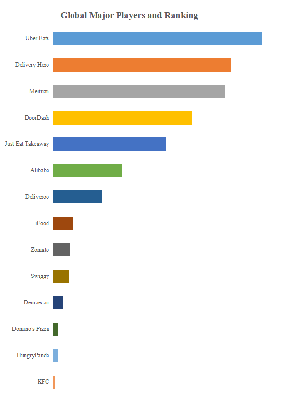 YHResearchのトップ企業研究センターによると、オンライン注文の世界的な主要製造業者には、Uber Eats、Delivery Hero、Meituan、DoorDash、Just Eat Takeaway、Alibaba、Deliveroo、iFood、Zomato、Swiggyなどが含まれている。2023年、世界のトップ5企業は売上の観点から約70.0%の市場シェアを持っていた。